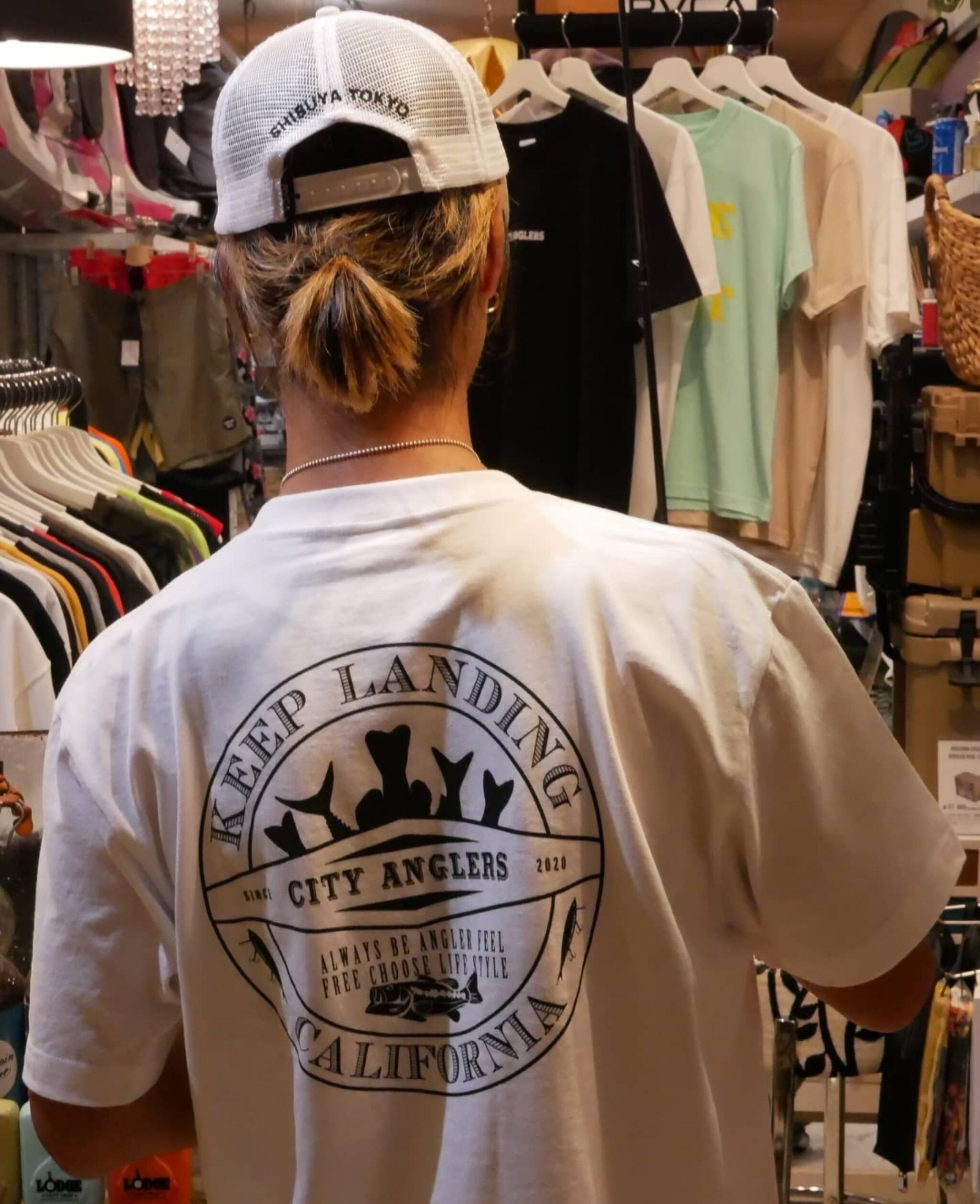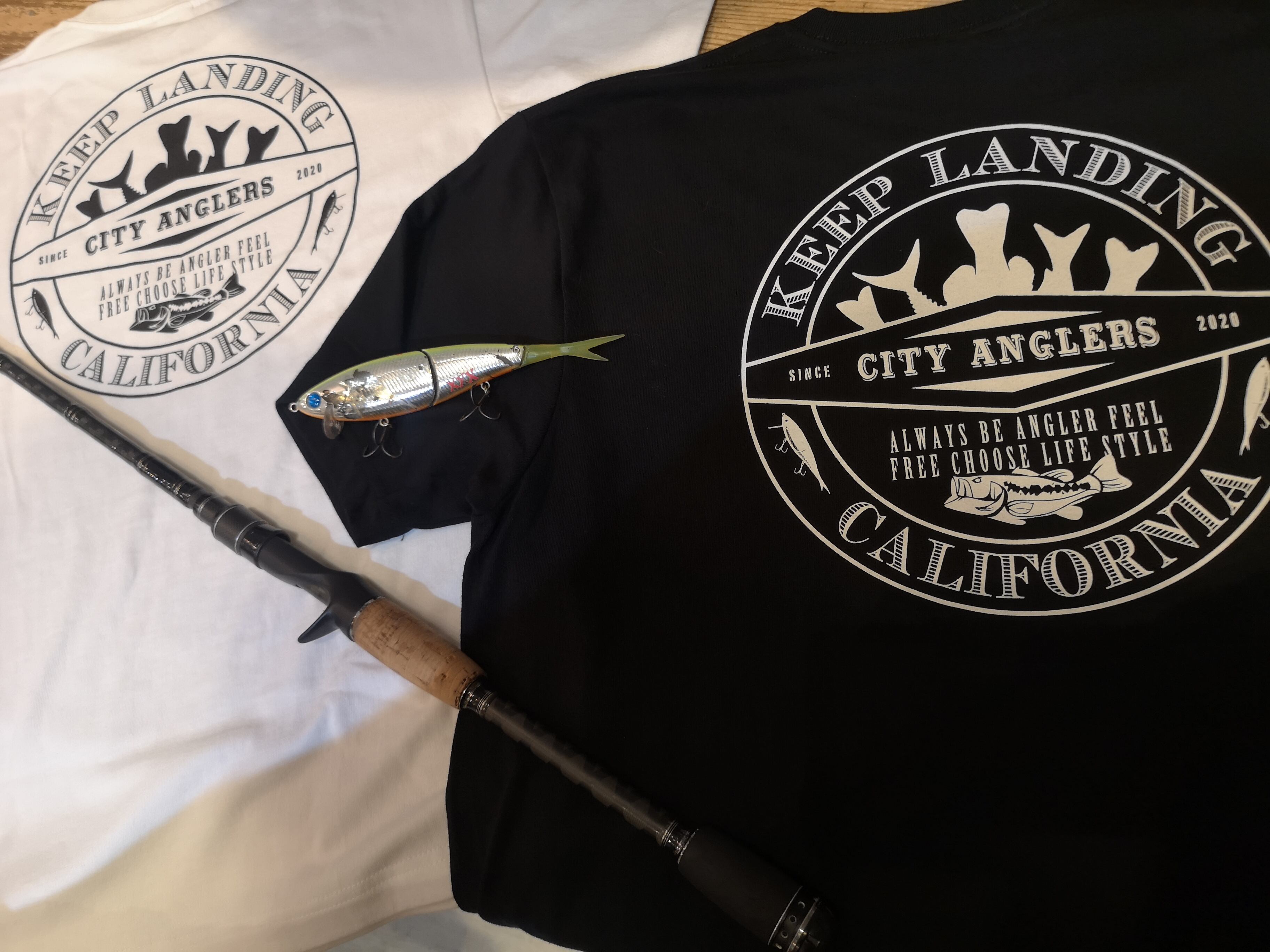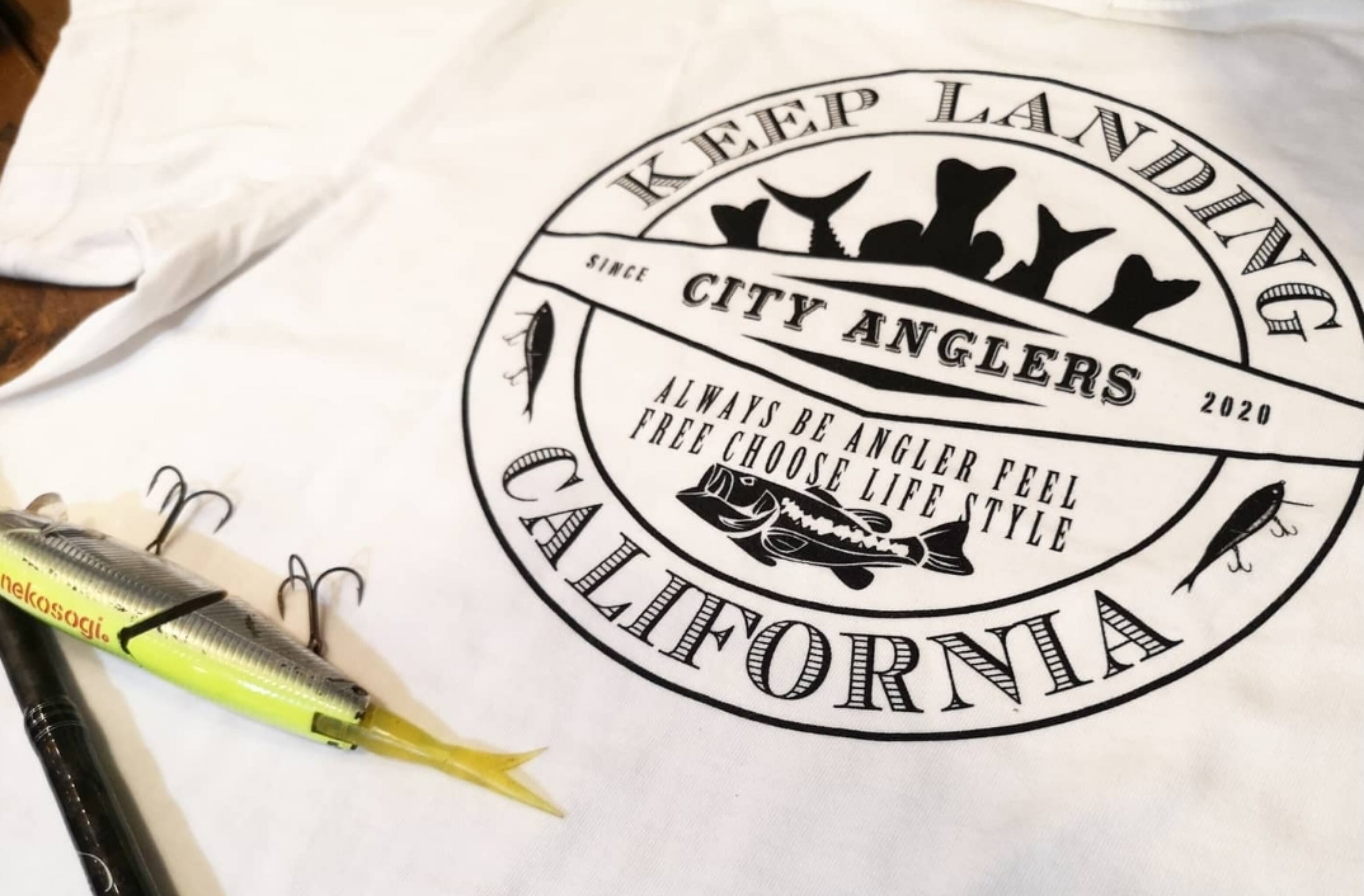 バックプリントにブラックバスとルアーを施した、カリフォルニアスタイルのフィッシングTee.